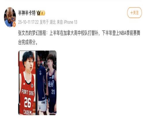 原文写道:张文杰的梦幻旅程:上半年在加拿大高中校队打替补,下半年登上NBA季前赛舞台完成得分。