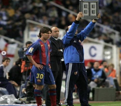 2004年10月16日,西甲第7轮,巴萨客战西班牙人,梅西于第82分钟身披30号球衣替补登场,完成一线队正式比赛首秀。
