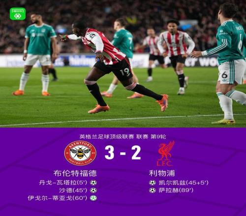 北京时间10月26日,英格兰足球超级联赛第9轮展开较量,布伦特福德坐镇主场迎战利物浦。上半场瓦塔拉倒钩破门,维尔茨中路爆射滑门而出,沙德单刀扩大比分,凯尔凯兹中路打门扳回一球,下半场蒂亚戈点射破门,瓦塔拉屡造险,萨拉赫爆射扳回一球。最终,全场比赛结束,布伦特福德以3-2战胜利物浦。