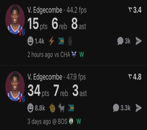 76人新科探花VJ-埃奇库姆首发出战39分半钟,15投6中,三分3中1,罚球2中2,得到15分6板8助3断1帽2失误,正负值+9全队第三。跟生涯首秀34+7+3相比,埃奇库姆的表现有所回落。但是再看看同届新秀,他已经足够出色。