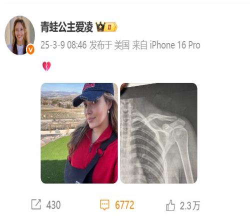 3月9日,谷爱凌发了一条微博,没有文字,只有一个心碎的表情,一张手臂绑着吊带的照片,还有一张锁骨骨折的X光片。